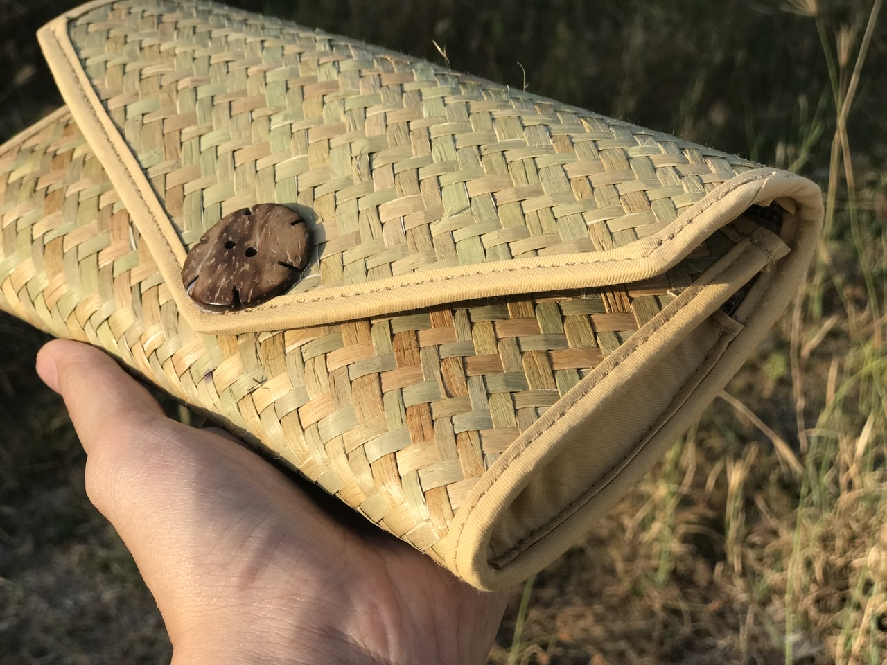 Nếu bạn còn đang lo lắng lựa chọn mẫu ví nào vừa có thể mang được những đồ vật cần thiết và cũng rất thích hợp chụp ảnh để tôn lên được dáng vẻ của ngày Tết cổ truyền. Thì bạn có thể lựa chọn mẫu ví cầm tay làm từ cỏ bàng này. Ví không chỉ là một sản phẩm thân thiện với thiên nhiên mà còn là một sản phẩm vô cùng phù hợp để mang đi mỗi dịp lễ Tết.