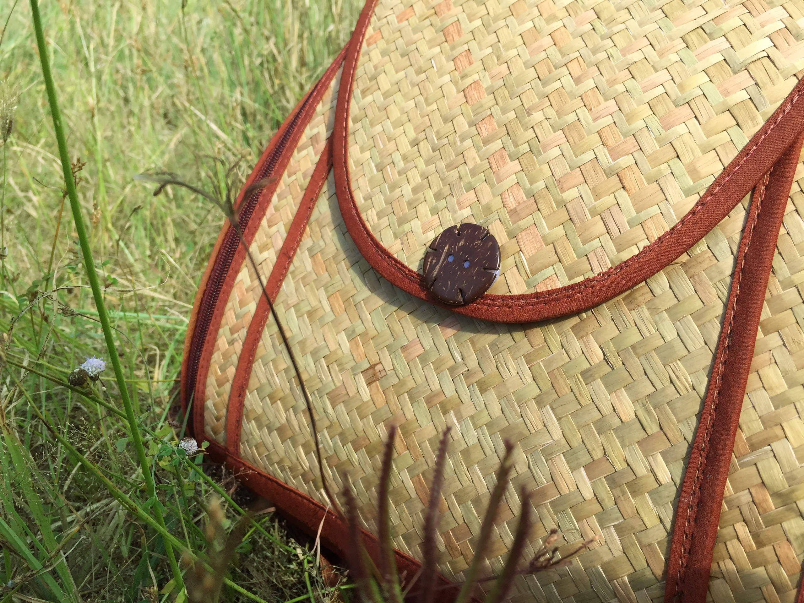 - Lớp bên ngoài được đan chắc chắn bằng cỏ bàng, những đường đan chi tiết tỉ mỉ, được làm thủ công bởi các nghệ nhân là người dân địa phương. Vì lớp ngoài là lớp cỏ khô nên nó rắn chắc, đàn hồi tốt, được thiết kế để làm bộ khung cho giỏ. Đường chỉ may ngay ngắn, ngăn nắp, đồng đều. Màu chỉ được lựa chọn, hài hoà với tổng thể màu của giỏ, không bị chõi màu. Cho nên, lớp vỏ ngoài của balo được ví như người phụ nữ Việt Nam rắn rỏi, bất khuất.