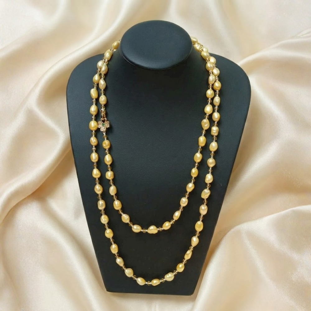 Vòng Cổ Ngọc Trai Nước Ngọt Baroque là thiết kế mang đậm tinh thần nghệ thuật và cá tính, nổi bật với những viên ngọc trai baroque tự nhiên có hình dáng độc đáo, không trùng lặp. Tông vàng ánh kim ấm áp kết hợp cùng pha lê lấp lánh tạo nên tổng thể vừa sang trọng vừa hiện đại, phù hợp với xu hướng trang sức thời trang cao cấp.