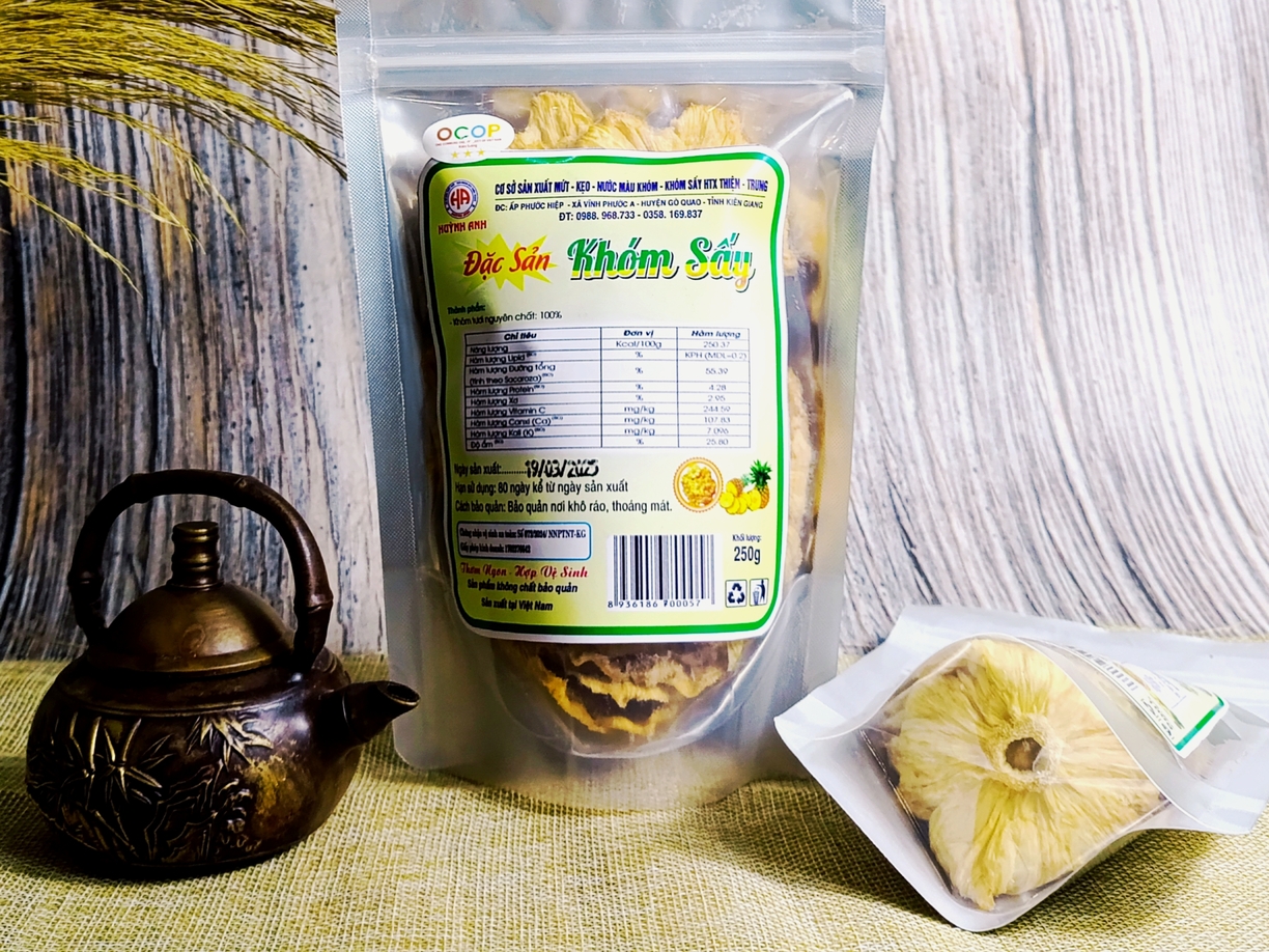 Khóm sấy là một sản phẩm ăn vặt tốt cho sức khỏe với 100 thành phần là khóm tự nhiên không chứa chất phụ gia an toàn tuyệt đối cho người sử dụng