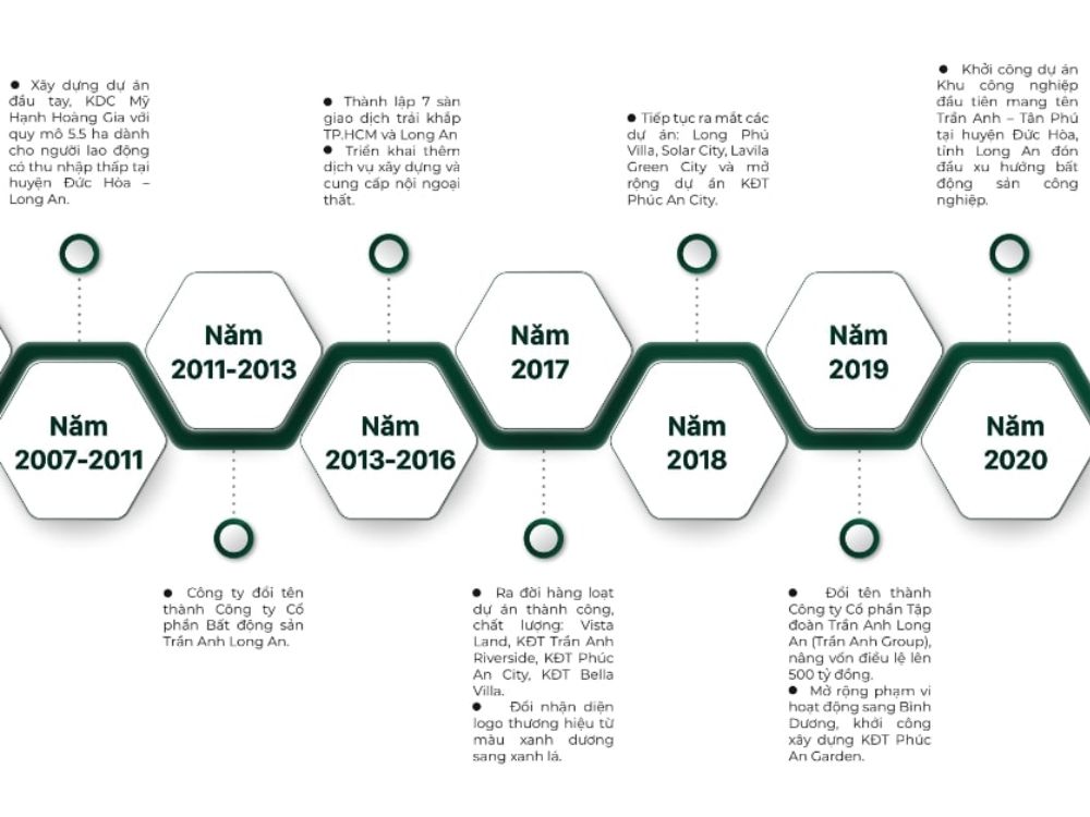 Giai đoạn từ 2009 - 2011: Từ khi thành lập cho đến nay, Trần Anh Co. ngày càng phát triển vững mạnh. Trần Anh CoLtd bắt tay vào xây dựng dự án khu dân cư nhà ở dành cho công nhân với quy mô 5,5 ha tại xã Mỹ Hạnh Nam, huyện Đức Hòa, tỉnh Long An.