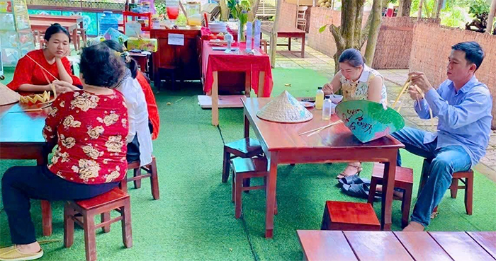 Du khách miệt mài làm đồ thủ công tại vườn Tuấn Tường