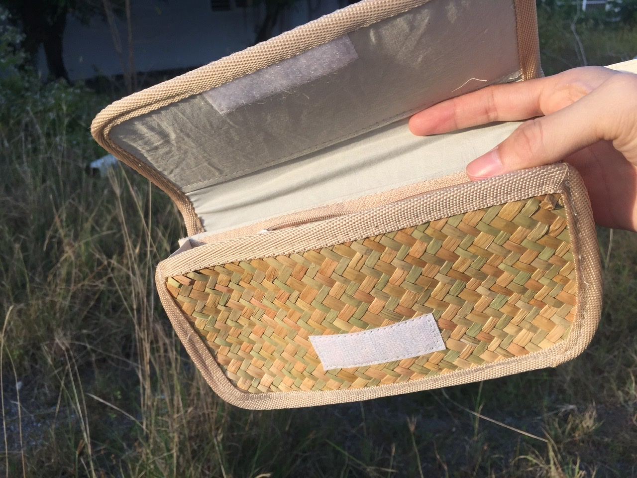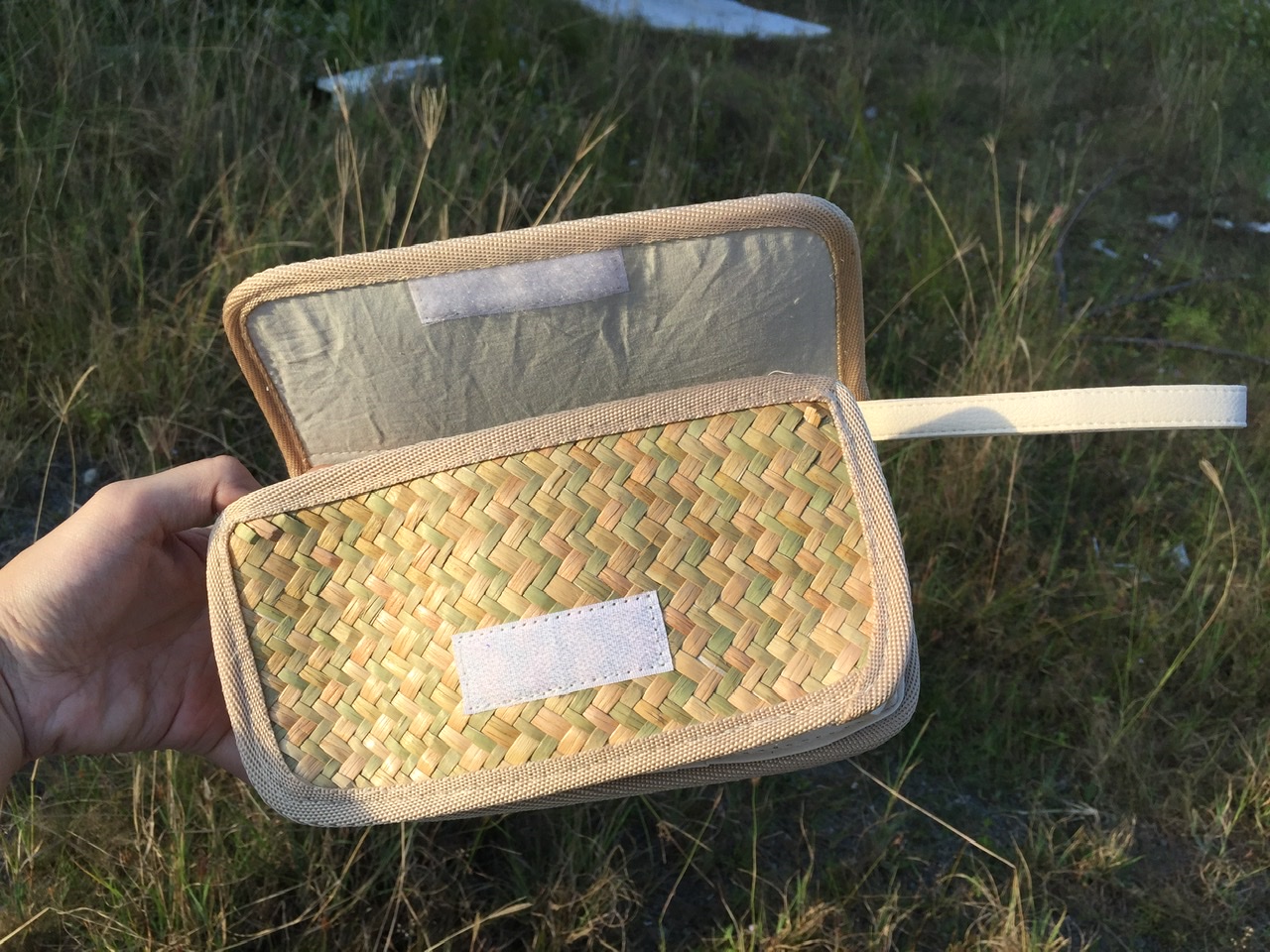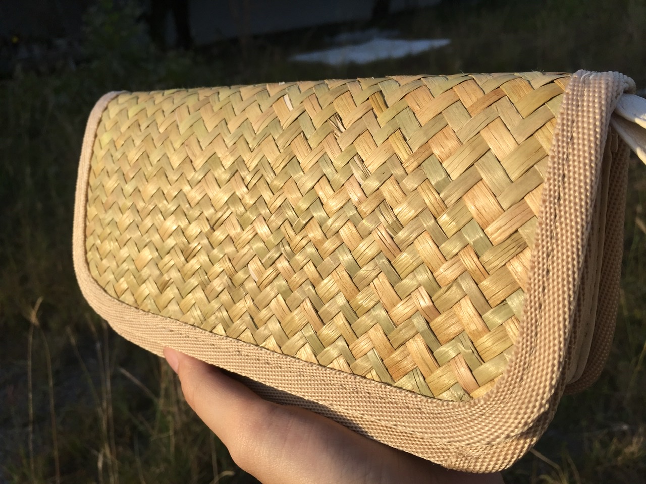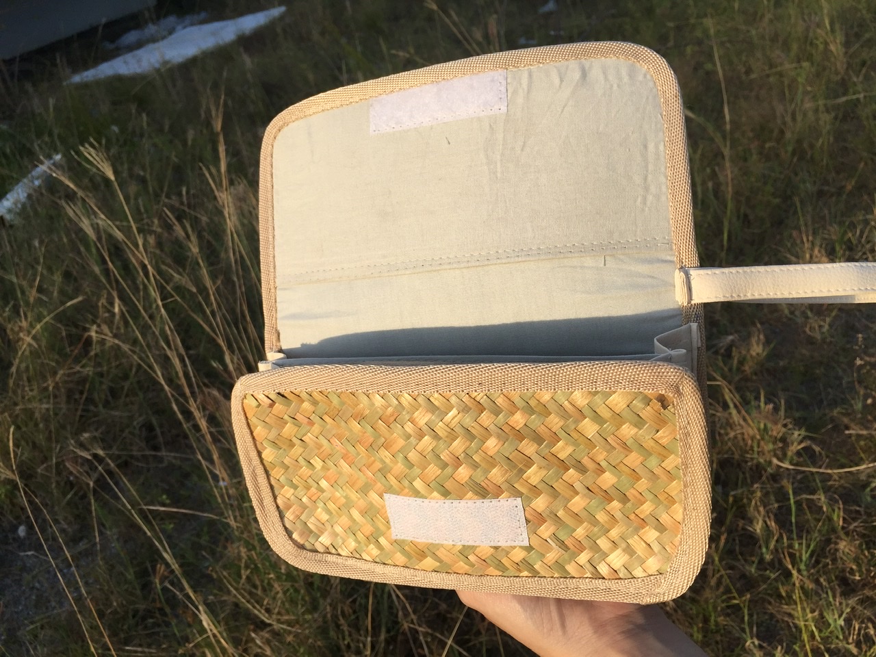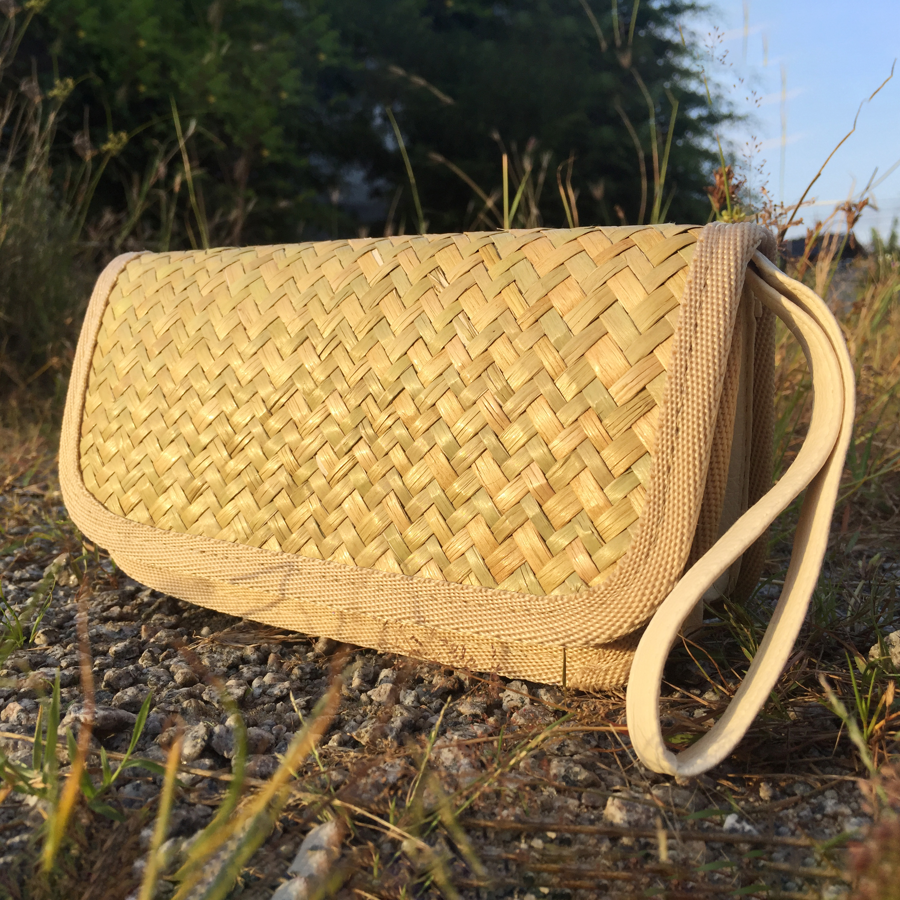 Ví cầm tay được làm từ cỏ bàng tự nhiên 100%, được đan thủ công bởi người dân địa phương